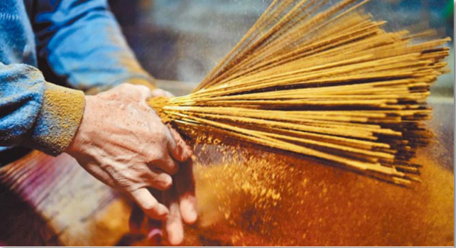 神香屬手工制作行業(yè),可分搓香、淋香和榨香三種制法。昔日澳門的制香廠多集中在沙梨頭及田畔街一帶的空曠土地上,以方便曬香。澳門神香制成品種類多樣,有長短、粗細、形狀、顏色之分,價格也會因應(yīng)香料質(zhì)量優(yōu)劣高低而有所不同。